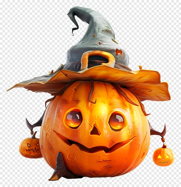 Get into the Halloween spirit with this adorable and vibrant PNG image of a friendly jack-o'-lantern! This charming pumpkin character wears a weathered witch hat, features sparkling, expressive eyes, and is accompanied by two smaller, glowing mini-pumpkins. Perfect for adding a touch of spooky fun to your digital projects, social media posts, invitations, or decorations. With its transparent background, it's ready to drop into any design. Download this high-quality, free Halloween pumpkin PNG today and bring a smile to your autumnal creations!