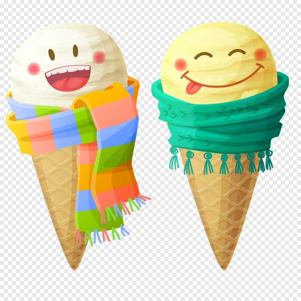 Chill out with these adorable, free PNG images featuring two delightful cartoon ice cream cones bundled up in cozy winter scarves! One charming vanilla scoop wears a vibrant, striped scarf and smiles wide, while its cheerful lemon-flavored friend peeks out from a stylish teal knitted scarf with playful tassels, cheekily sticking out its tongue. Both happy characters sit snugly in classic waffle cones, ready to bring warmth and whimsy to your projects. Perfect for adding a sweet, humorous touch to winter-themed designs, holiday greetings, kids' crafts, social media posts, educational materials, or personal projects. Download this high-quality, transparent background PNG instantly and infuse your creations with these irresistibly cute, cold-weather-ready dessert characters!