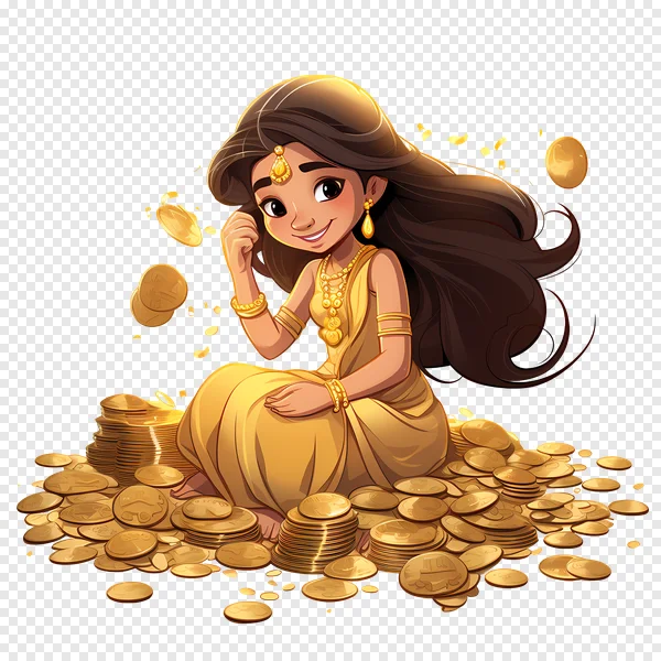 Download this vibrant free PNG image featuring an adorable cartoon Indian girl surrounded by a treasure of shining gold coins. Dressed in a beautiful golden traditional outfit with matching jewelry, she smiles brightly, symbolizing wealth, prosperity, and good fortune. This charming illustration is perfect for projects related to finance, success, culture, or festive celebrations like Diwali. The transparent background makes it easy to integrate into any design. Get your high-quality, free download today and add a touch of golden abundance to your creative work!