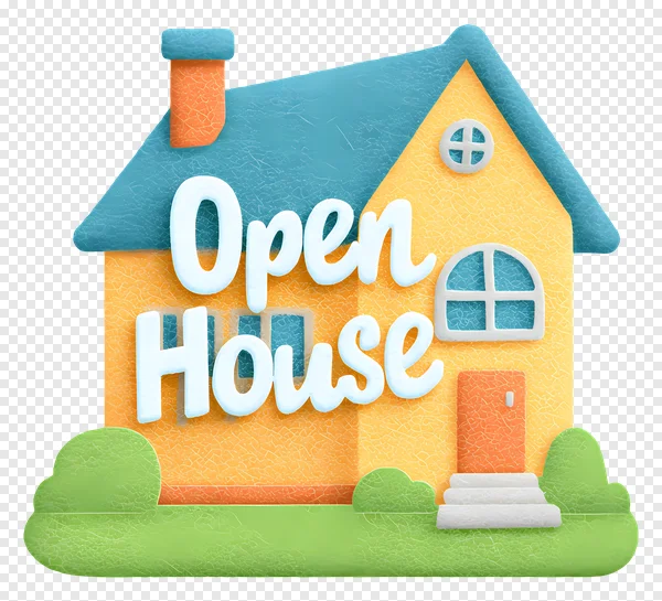 Invite prospective buyers with this adorable 'Open House' PNG illustration! Featuring a charming yellow house with a vibrant blue roof, an orange chimney, and inviting green bushes, this graphic is perfect for real estate marketing materials, event flyers, property listings, or digital announcements. The playful, textured design and prominent 'Open House' text make it an eye-catching visual. Download this high-quality, free PNG with a transparent background for your next residential property promotion, social media post, or website design. Ideal for realtors, home sellers, and anyone looking for a friendly touch to their property advertisements.