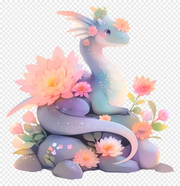 Download this enchanting free PNG of a cute pastel baby dragon, perfect for adding a touch of magic to your projects. Adorned with delicate pink and orange flowers and resting peacefully among soft purple rocks, this adorable fantasy creature boasts serene blue and lavender hues with charming speckles. Its transparent background makes it ideal for seamless integration into children's designs, nursery decor, magical invitations, digital scrapbooking, or any creative endeavor needing a whimsical touch. Get your high-quality, free dragon clipart today and ignite your imagination!