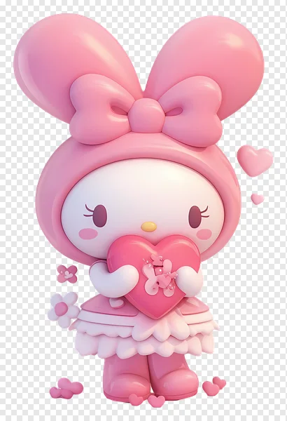 Download this charming My Melody PNG for free, featuring the beloved Sanrio character in an adorable pink hooded outfit with a big bow. She's sweetly holding a prominent pink heart, surrounded by floating smaller hearts and delicate flowers, all rendered in a delightful 3D glossy style. This high-quality, transparent image is perfect for adding a touch of kawaii cuteness to your Valentine's Day projects, romantic cards, digital scrapbooking, social media graphics, personal crafts, and more. Elevate your designs with this sweet and lovable My Melody illustration. Get your free download now!