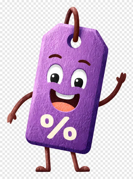 Download this adorable, high-quality purple discount tag character PNG for free! Perfect for sales promotions, marketing materials, website graphics, or adding a fun touch to your designs. This cheerful tag with a percentage symbol is ideal for illustrating deals, offers, and special prices. Get instant access to this transparent background image and boost your creative projects today! No attribution required.