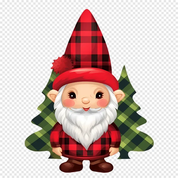 Discover our adorable Christmas Gnome PNG, featuring a cheerful gnome character dressed in a cozy red and black buffalo plaid hat and matching shirt, complemented by a fluffy white beard and rosy cheeks. Behind him, two charming green plaid Christmas trees add a rustic holiday touch. This high-quality, transparent PNG graphic is perfect for all your festive projects, from holiday cards and digital scrapbooking to website banners, social media posts, and DIY crafts. Download this free, versatile Christmas gnome image today to infuse your designs with a touch of Nordic charm and cozy holiday spirit! Enhance your seasonal decor with this delightful, easy-to-use graphic.