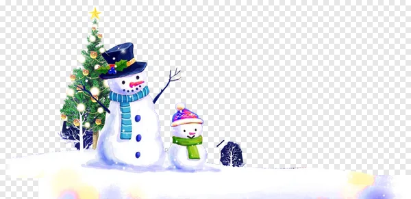 Download this charming free PNG image featuring two adorable snowmen and a beautifully decorated Christmas tree. The larger snowman sports a stylish top hat and blue striped scarf, while the smaller one wears a cozy, colorful knit hat and green scarf, standing on a glistening snow-covered ground. The festive tree twinkles with lights, golden ornaments, and a radiant star. This high-quality, transparent background illustration is perfect for adding holiday cheer to your greeting cards, presentations, social media posts, crafts, and any winter-themed digital project. Get your joyful Christmas and winter scene PNG for free today!