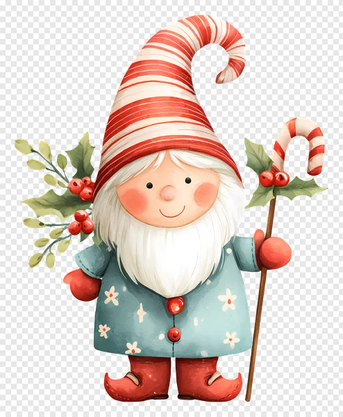 Bring festive cheer to your projects with this adorable watercolor Christmas gnome PNG! Featuring a charming gnome in a red and white striped hat and blue coat, holding a candy cane staff adorned with holly and bright red berries. This high-quality, transparent background illustration is perfect for holiday cards, digital crafts, seasonal decorations, scrapbooking, or any creative design. Download this whimsical gnome for free and add a touch of magic to your Christmas creations. Ideal for designers, crafters, and anyone seeking cute holiday clip art with a transparent background.