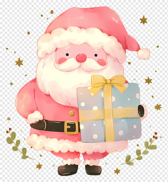 Download this adorable watercolor Santa Claus PNG for free! This charming illustration features a cheerful, rosy-cheeked Santa in a pink suit and hat, holding a polka-dotted blue gift box with a golden ribbon. The transparent background makes this festive clipart perfect for layering into your Christmas cards, holiday invitations, social media graphics, craft projects, or digital designs. Add a whimsical touch of joy and holiday magic to your seasonal creations with this high-quality, free-to-download Santa character!