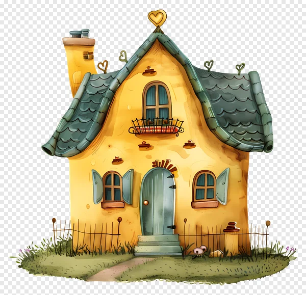 Discover this enchanting free PNG image of a whimsical cartoon house, perfect for adding a touch of magic to your projects! This charming illustration features a bright yellow house with a distinctive blue-grey scalloped roof, topped with a golden heart. Details include quaint arched windows with open shutters, a small balcony overflowing with vibrant flowers, and a rustic wooden fence surrounding lush green grass. A tiny, adorable creature peeks from behind the fence, adding to its storybook appeal. Ideal for children's books, digital art, scrapbooking, invitations, and more. Download this high-quality, transparent PNG for free and let your creativity flourish!