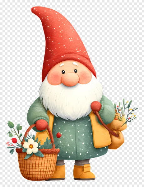 Discover this charming, whimsical gnome PNG, perfect for adding a touch of magic to your holiday and winter projects! This adorable cartoon character features a classic red pointed hat with snow speckles, a long flowing white beard, rosy cheeks, and a cozy green coat. He's cheerfully carrying a rustic wicker basket filled with festive flowers and berries, alongside a yellow sack bursting with winter foliage. Ideal for Christmas cards, scrapbooking, digital art, invitations, seasonal decorations, sublimation, or any creative design needing a delightful, festive sprite. Download this high-quality, free transparent PNG image today and bring a joyful spirit to your creations with this enchanting gardener gnome illustration.