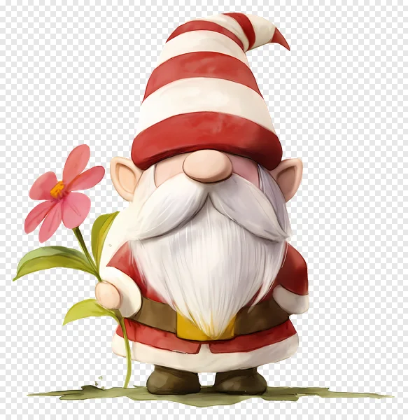 Download this charming and cute whimsical gnome holding a vibrant pink flower PNG for your creative projects! Featuring a festive red and white striped hat, a long flowing white beard, and a friendly presence, this high-quality illustration comes with a transparent background, making it perfect for seamless integration into any design. Ideal for Christmas cards, garden-themed decor, spring invitations, digital scrapbooking, or adding a touch of magic to your website or social media. Get this delightful gnome artwork absolutely free and elevate your designs today!