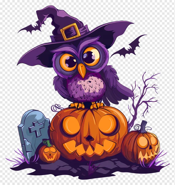 Conjure up some Halloween magic with this charming, free PNG illustration! Discover an adorable purple owl, sporting a classic witch hat with subtle bat accents, perched regally atop a glowing, carved jack-o'-lantern. This delightful yet spooky scene is brought to life with additional smaller pumpkins, a weathered tombstone, and a stark bare tree, all set against an atmospheric dark backdrop. Ideal for Halloween party invitations, digital crafts, social media graphics, greeting cards, educational resources, or adding a festive touch to any creative project. Download this high-quality, transparent PNG image instantly to infuse your holiday designs with a perfect blend of cuteness and eerie fun!