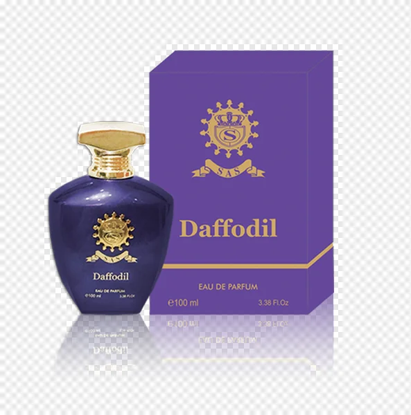 Download this exquisite, free PNG image of Daffodil Eau de Parfum, showcasing a luxurious deep purple perfume bottle with an elegant gold cap and matching branded box. This high-resolution product shot features the "SAS" crown logo, "100ml," and "3.38 Fl.Oz" details clearly. Perfect for beauty blogs, e-commerce sites, graphic design projects, advertisements, or any creative content needing a sophisticated fragrance visual. Enhance your designs with this premium, ready-to-use PNG image. Get your free download now and add a touch of elegance to your work!