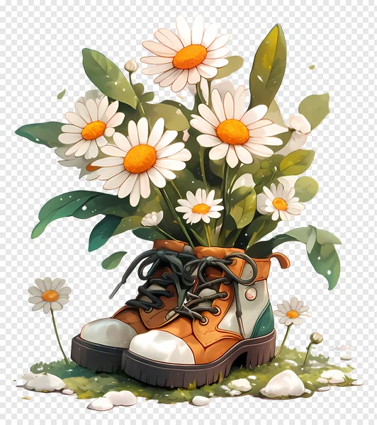 Download this beautiful free PNG image of daisies blooming from a worn leather boot! Perfect for spring designs, nature-themed projects, greeting cards, website graphics, and more. This high-quality illustration features a charming, whimsical style with vibrant colors and a transparent background for easy integration into your creative work. Enhance your designs with this unique floral element – download now and let your imagination grow!