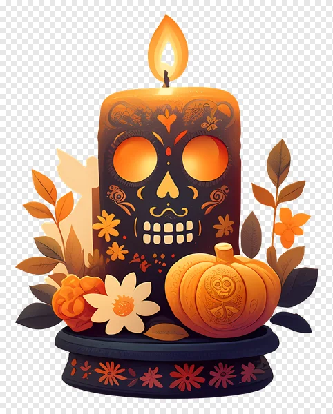 Download this stunning Day of the Dead candle PNG image for free! Featuring a beautifully illustrated skull candle with intricate details, surrounded by vibrant marigolds, pumpkins, and foliage. Perfect for Halloween, Dia de los Muertos, or any festive project. Use it for digital art, graphic design, social media, or print. High-resolution and transparent background for easy integration into your designs. Get your free download now!