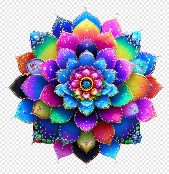 Immerse your projects in spiritual elegance with this free, high-resolution Dazzling Rainbow Mandala Flower PNG. This intricate digital artwork showcases a captivating layered lotus-like design bursting with a full spectrum of vibrant, glowing rainbow colors: deep blues, royal purples, hot pinks, fiery oranges, sunny yellows, and lush greens. Each symmetrical petal is exquisitely detailed with shimmering gold accents, sparkling gemstones, and delicate crystal-like droplets, creating a rich, jeweled texture. Perfect for enhancing spiritual designs, meditation projects, graphic art, invitations, website backgrounds, or any creative endeavor needing a touch of elegant, psychedelic charm. Download this stunning, transparent-background mandala instantly for your personal and commercial use!