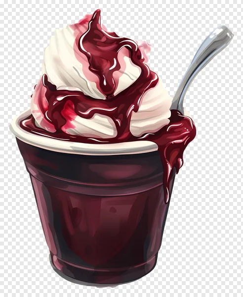 Craving a sweet indulgence? Download this mouth-watering transparent PNG of a decadent dessert featuring a swirl of creamy whipped cream or soft serve, generously drizzled with rich, vibrant cherry or berry sauce. A metallic spoon peeks out, ready to scoop up this delightful treat served in a stylish dark cup. This high-quality food graphic is perfect for menus, food blogs, social media posts, digital art, or any project needing an appetizing, sweet visual. Get this free PNG download and add a touch of deliciousness to your designs today!