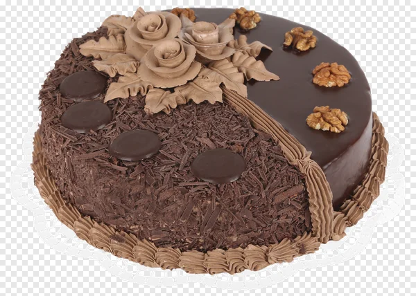 Indulge your audience with this exquisite chocolate cake PNG, a visual symphony of rich flavors and elegant design. This high-quality image showcases a luscious dark chocolate cake, half-covered in a smooth, glossy glaze adorned with crunchy walnuts, and the other half generously blanketed in fine chocolate shavings. Beautiful mocha-colored frosting roses and leaves, along with delicate chocolate discs, complete the decadent look. Perfect for bakery websites, food blogs, recipe cards, birthday invitations, or any digital project requiring a touch of gourmet sweetness. Download this transparent background PNG for free and add an irresistible, professional touch to your designs!