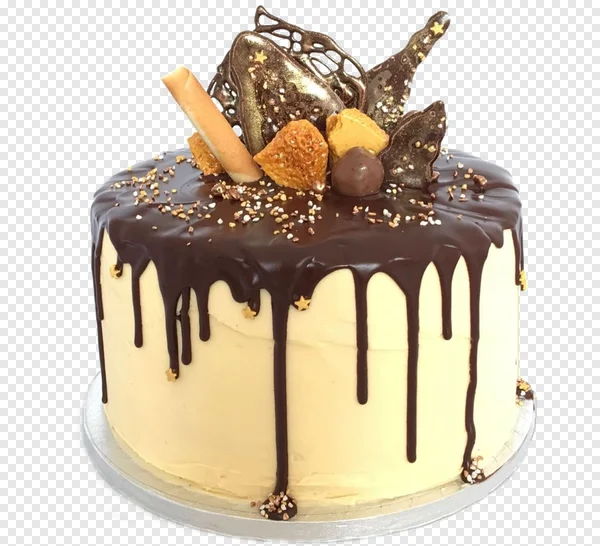 Download this stunning chocolate drip cake PNG for free! This luxurious dessert features a round cake generously covered in rich dark chocolate ganache, gracefully dripping over smooth cream-colored buttercream frosting. It's elegantly decorated with a crispy chocolate wafer stick, golden honeycomb pieces, a decadent chocolate truffle, artistic chocolate shards with gold flecks, and shimmering gold star sprinkles. Perfect for adding a gourmet touch to your birthday party invitations, bakery advertisements, website visuals, or any celebration-themed project. Get this high-quality, transparent background image now to enhance your design projects with a visually appealing, sweet treat.