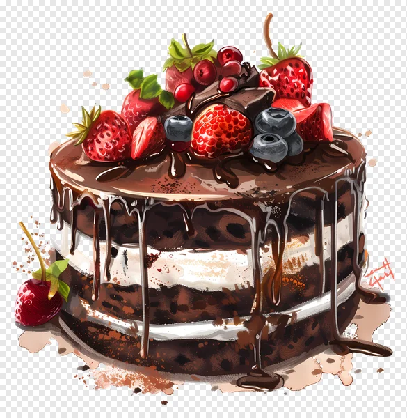Download this mouth-watering, high-quality PNG of a decadent chocolate layer cake for free! Featuring rich chocolate sponge layers, creamy white frosting, and luscious chocolate ganache dripping elegantly down the sides, this illustration is topped with an abundant array of fresh mixed berries, including vibrant red strawberries, juicy blueberries, and tart cranberries. The transparent background makes it perfect for a variety of creative projects – from digital menus and recipe cards to birthday invitations, celebratory social media posts, or adding a sweet touch to your website. Get your free dessert clipart today and sweeten up your designs!