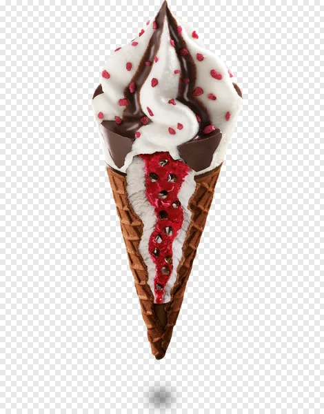 Indulge your senses with this stunning free PNG image of a decadent ice cream cone. Featuring creamy vanilla soft serve, generously drizzled with rich dark chocolate, and topped with vibrant red berry sprinkles, this image captures pure dessert bliss. The crispy waffle cone is artfully presented to reveal a luscious red berry swirl filling mixed with chocolate chips, making it an irresistible frozen treat. Perfect for food blogs, menu designs, summer promotions, marketing campaigns, or any graphic design project. Download this high-quality PNG now with a transparent background for easy integration into your creative work and add a touch of sweetness to your visuals!
