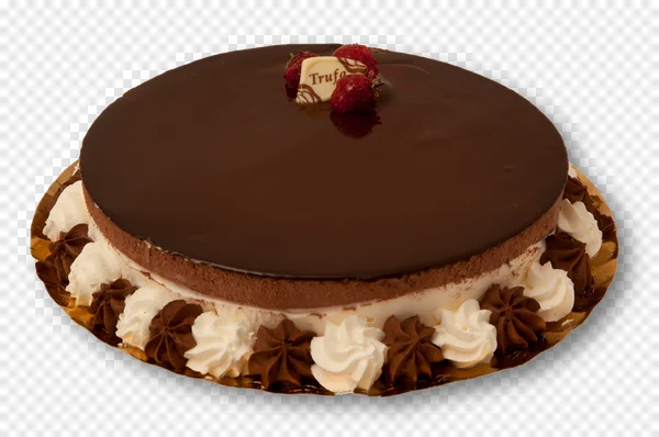 Indulge your senses with this exquisite, high-quality PNG image of a luxurious multi-layer chocolate truffle cake. Perfect for any special occasion, this mouth-watering dessert features a rich, glossy chocolate ganache topping, a smooth chocolate mousse interior, and is elegantly adorned with fresh, vibrant raspberries and a delicate 'Trufa' white chocolate piece. The sides are beautifully decorated with alternating swirls of decadent chocolate and fluffy vanilla whipped cream, all presented on a sophisticated golden cake board. Ideal for food blogs, restaurant menus, event invitations, digital advertisements, or any design project needing a gourmet visual. Download this stunning, transparent background image for free and add a touch of professional sweetness to your creations!