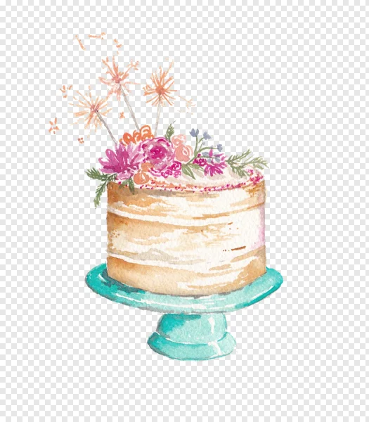 Download this enchanting free PNG of a delicate watercolor floral celebration cake, perfect for adding a touch of whimsy to your designs. This beautifully illustrated naked cake features soft pastel frosting, adorned with vibrant pink and orange flowers, lush green foliage, and sparkling party sparklers. Perched elegantly on a charming teal cake stand, this transparent image is ideal for birthday invitations, wedding stationery, anniversary cards, party flyers, digital scrapbooking, or creating festive social media graphics. Enhance your creative projects with this high-quality, free-to-download watercolor cake illustration. Get your transparent floral cake PNG now!