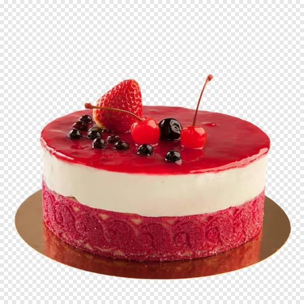 Download this exquisite PNG image of a delectable berry mousse cake, perfect for any celebration. Featuring a vibrant red velvet-style textured base, a creamy white mousse layer, and a glossy red berry glaze, it's artfully adorned with fresh strawberries, bright red cherries, and dark blueberries. This high-resolution, isolated dessert image is ideal for menus, websites, blogs, graphic design projects, or virtual party invitations. Enhance your culinary designs and sweet projects instantly with this free, transparent background PNG. Get your delicious dessert graphic now!