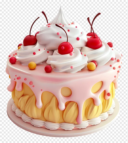 Indulge in this deliciously vibrant cherry cake PNG image, available for free download! Featuring luscious white whipped cream peaks, juicy red cherries with stems, a sweet pink dripping glaze, and playful colorful sprinkles, all on a charming yellow cake base with a transparent background. Perfect for enhancing your birthday invitations, party graphics, dessert menus, baking blogs, social media posts, or any creative design project. This high-quality, eye-catching dessert illustration brings a festive and sweet touch to your digital content. Download this delightful treat instantly and add a pop of color to your designs!