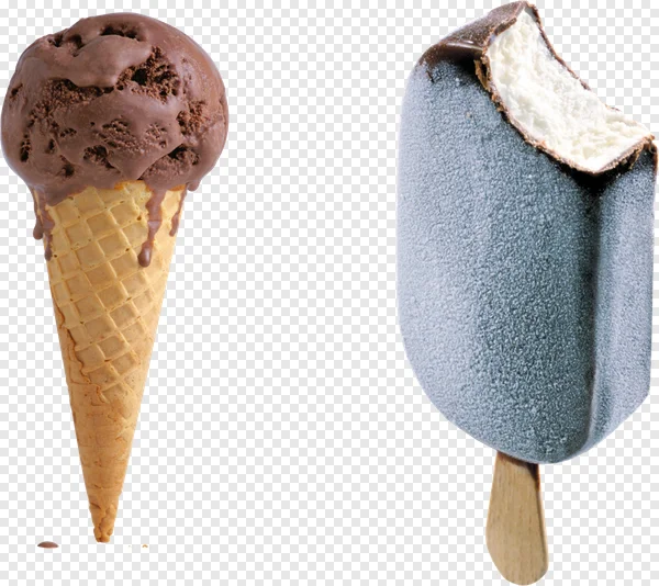Download this irresistible free PNG image featuring two classic frozen treats! On the left, a generously scooped chocolate ice cream drips enticingly down a crisp waffle cone. On the right, a delightful vanilla ice cream bar on a stick, coated in frosty blue chocolate, shows a satisfying bite. Perfect for food blogs, restaurant menus, summer promotions, graphic design projects, or any sweet-themed content. Get your high-resolution, transparent ice cream download today and add a touch of deliciousness to your designs!