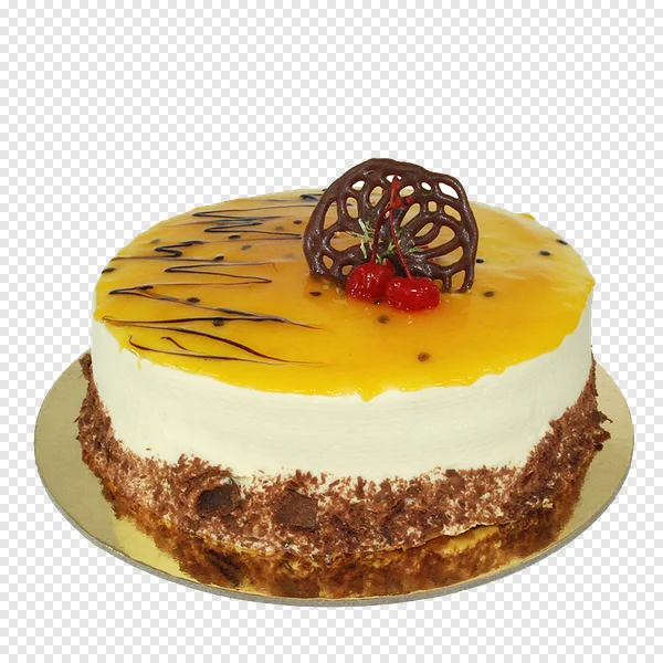 Indulge your senses with this vibrant, high-quality PNG image of a gourmet passion fruit mousse cake. This visually stunning dessert features a glossy yellow fruit glaze adorned with elegant chocolate drizzles and delicate dark specks, topped with an intricate chocolate lattice and two juicy red cherries. The cake boasts a creamy white layer, beautifully contrasted by rich chocolate shavings around its base, all presented on a shimmering golden cake board. Perfect for bakery websites, restaurant menus, event invitations, advertisements, or any creative project needing a delectable touch. Download this transparent background PNG for free and sweeten up your designs today!