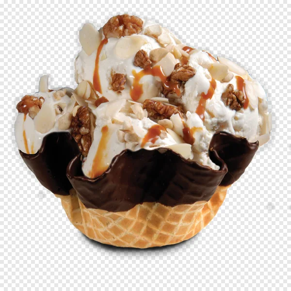 Indulge in this high-resolution, transparent PNG of a scrumptious vanilla ice cream sundae. This mouth-watering dessert is nestled in a crispy, chocolate-dipped waffle bowl, generously topped with glistening caramel sauce, crunchy walnuts, and delicate almond slivers. Perfect for food blogs, restaurant menus, social media posts, advertising campaigns, or any creative project requiring a vibrant, tempting sweet treat. Download this exquisite, high-quality PNG image for free and add a touch of irresistible delight to your designs!