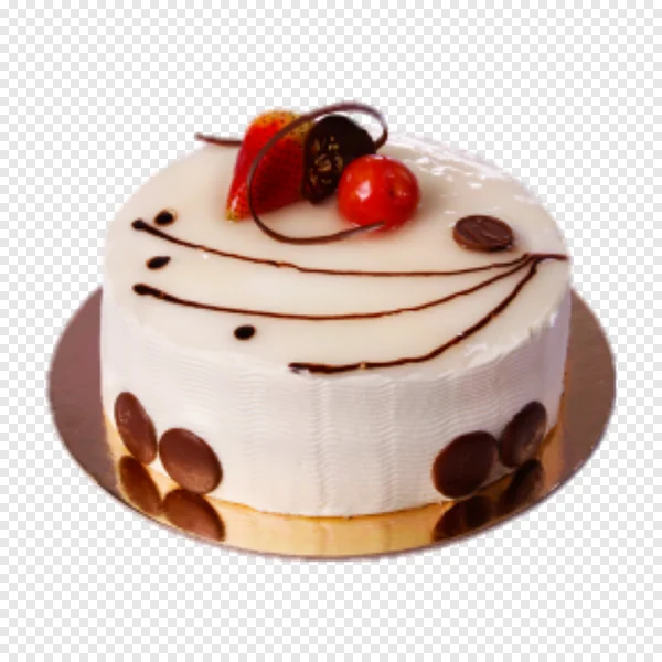 Download this stunning, high-quality PNG of a delightful white frosted cake, meticulously decorated with a fresh strawberry, a vibrant red cherry, elegant chocolate curls, and delicate chocolate drizzles. The cake's sides are adorned with rich chocolate disks, while a subtle coffee bean detail adds a sophisticated touch, all presented on a shimmering gold cake board. Ideal for adding a touch of sweetness to your graphic designs, birthday invitations, bakery menus, website banners, or holiday e-cards. This free-to-download image comes with a transparent background, making it perfectly versatile for all your digital projects. Elevate your visual content with this irresistible dessert! No attribution required.