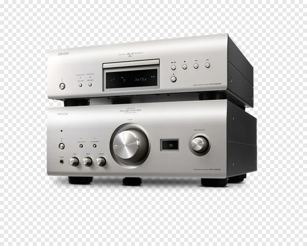 Elevate your home audio experience with this stunning free PNG of the Denon DCD-2500NE Super Audio CD Player and PMA-2500NE Integrated Amplifier stack. This high-resolution image showcases the sleek silver, brushed metal design of Denon's premium hi-fi components, featuring advanced AL32 Processing Plus for the DCD-2500NE and Ultra High Current MOS technology for the PMA-2500NE. Perfect for audiophiles, tech enthusiasts, or anyone needing a clean, isolated image of top-tier sound equipment. Use this transparent background PNG for presentations, website design, product mockups, or personal projects. Download now to add a touch of sophisticated audio quality to your creative work!