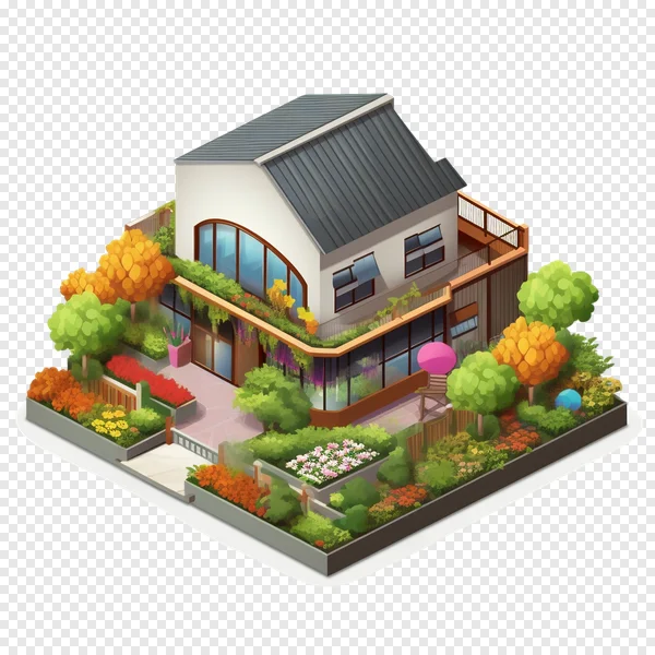 Discover our free, high-quality isometric modern house PNG, ideal for game development, architectural renders, or engaging web designs. This vibrant illustration showcases a stylish home with a grey roof, large glass windows, and an inviting balcony. The property is surrounded by a beautifully landscaped, lush garden featuring colorful flowers, autumn-toned trees, and a cozy patio with a pink umbrella. Perfect for projects requiring charming, eco-friendly, or urban dwelling visuals. Download this transparent background PNG instantly for your creative needs!