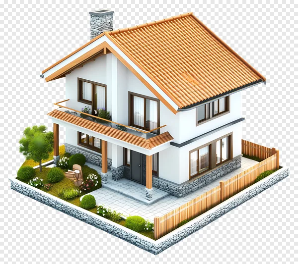 Download this stunning, free 3D isometric modern house PNG image, perfect for adding a touch of residential charm to your projects. This high-quality graphic features a beautifully rendered white house with a vibrant orange tiled roof, an inviting balcony, and a meticulously landscaped garden. Details include a lush green lawn, sculpted bushes, a small tree, a classic wooden fence, and a decorative stone wall. Ideal for architectural visualization, real estate presentations, game assets, educational materials, or any creative design needing a cozy home element. Get your transparent background house PNG now!