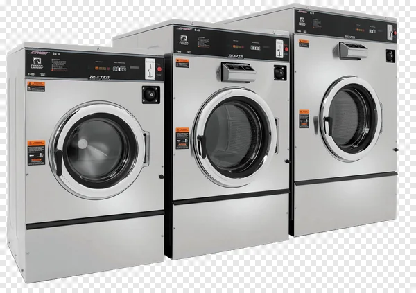 Download this high-resolution PNG image of Dexter commercial laundry equipment. Perfect for websites, brochures, and presentations showcasing industrial laundry solutions. This image features three Dexter machines: a T-450, T-950, and T-1450 model, showcasing their size and stainless steel design. Enhance your marketing materials with this professional-grade image and elevate your brand. Download now for free!