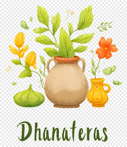 Celebrate the auspicious festival of Dhanteras with this vibrant, free PNG illustration! Featuring beautifully hand-drawn watercolor elements like a traditional kalash pot symbolizing wealth, bright marigold flowers for prosperity, a green gourd, and lush leaves, this transparent graphic is perfect for your festive projects. Download this high-quality Dhanteras art to create stunning greeting cards, social media posts, website banners, or educational materials. Ideal for conveying blessings of health and wealth during the beginning of Diwali festivities. Get your complimentary, high-resolution graphic today and add a touch of traditional Indian charm to your designs!