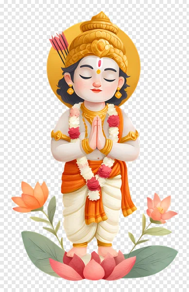 Tags: Balak Ram Diwali Hindu god Indian deity Lord Rama Namaste Ram Navami bow and arrow devotion divine free illustration golden crown lotus flower prayer religious art serene spiritual traditional attire transparent PNG watercolor style