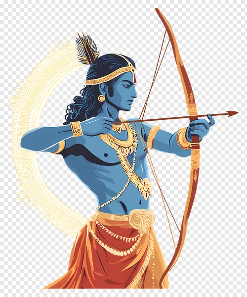 Download this striking PNG image of Lord Rama, the revered Hindu deity and seventh avatar of Vishnu, powerfully poised with his bow and arrow. This high-quality vector illustration features his iconic blue skin, adorned with intricate golden jewelry, a feathered crown, and a radiant golden chakra behind him. Perfect for religious projects, cultural designs, Diwali greetings, Ram Navami celebrations, or any spiritual artwork. Get this transparent background, high-resolution graphic for free and add a touch of divine strength to your creations today!