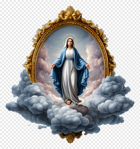 Discover this exquisite free PNG image featuring the Divine Virgin Mary, adorned with a radiant halo and flowing blue and white robes. She stands gracefully upon ethereal clouds, beautifully framed by an ornate, golden baroque-style frame. Perfect for religious projects, spiritual designs, church bulletins, digital art, or personal devotionals. This transparent background PNG allows seamless integration into any design. Download this sacred image for free and add a touch of heavenly grace to your creative work. Ideal for Christian themes, Catholic events, or any project seeking a revered spiritual icon. High-quality and ready for instant use!