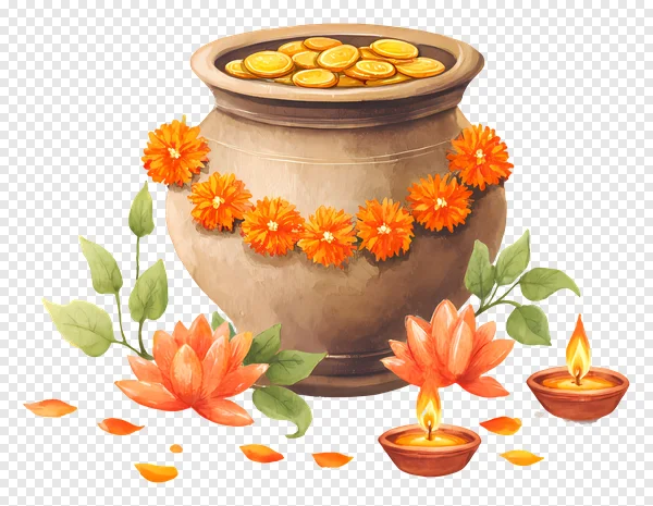 Tags: Diwali Hindu festival Indian festival Kalash Lakshmi Puja cultural graphics diyas festive decoration financial abundance gold coins good luck happy Diwali lotus flower marigold garland prosperity spiritual traditional Indian transparent background watercolor illustration wealth symbol