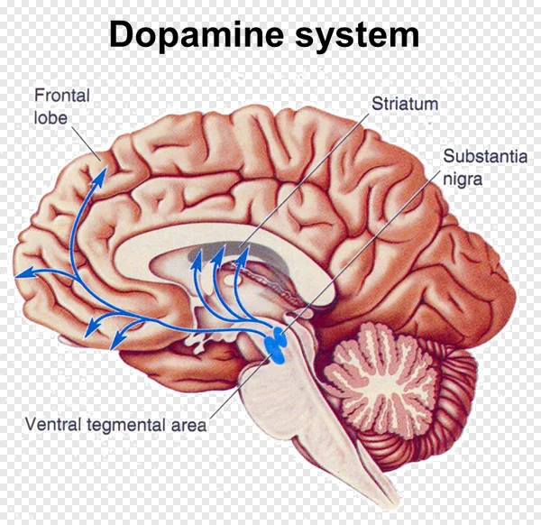 Explore the intricate Dopamine System pathways within the human brain with this detailed PNG diagram. Featuring key structures like the Ventral Tegmental Area (VTA), Substantia Nigra, Frontal Lobe, and Striatum, this illustration clearly depicts dopaminergic projections crucial for reward, motivation, and motor control. Perfect for educational presentations, research, or medical content. Download this high-quality neuroscience anatomy image for free to enhance your projects and deepen understanding of brain function. Ideal for students, educators, and researchers.
