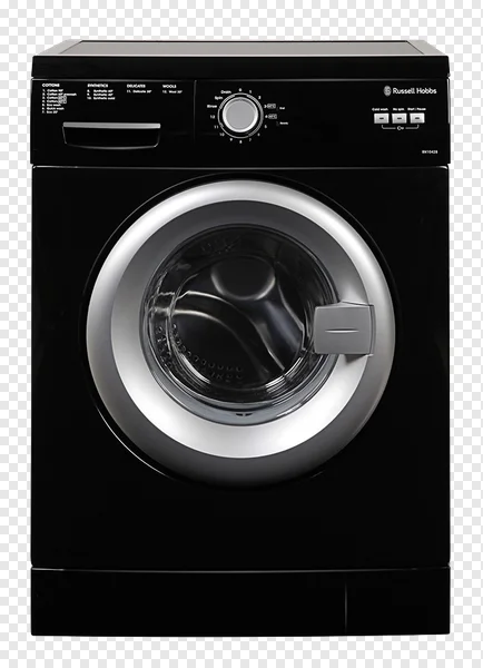 High-quality PNG image of a sleek black Russell Hobbs washing machine. Perfect for appliance websites, brochures, or presentations. Download this free, clean image with a transparent background for seamless integration into your projects. Enhance your designs with this realistic product image, showcasing the modern look and features of this washing machine. Get your download now!