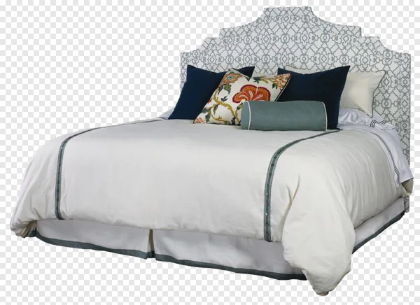Download this high-resolution PNG image of a beautifully styled bed, featuring a patterned headboard, cream bedding, and teal accents. Perfect for website design, presentations, or interior design projects. The image offers crisp detail and a clean background for easy integration into your work. Download now and elevate your visuals!