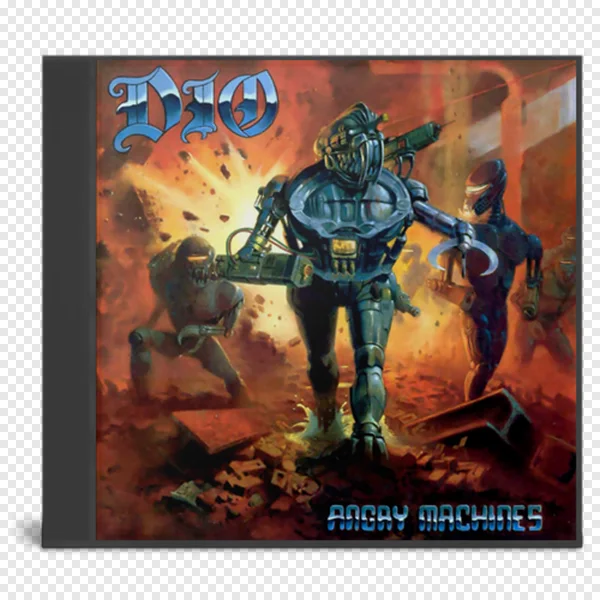 Dive into the epic world of heavy metal with this free PNG download of Dio's 'Angry Machines' album cover. Featuring a striking scene of powerful, menacing robots and cyborgs amidst a fiery, post-apocalyptic landscape of destruction and explosions. The iconic DIO logo and 'Angry Machines' title are prominently displayed, capturing the essence of classic sci-fi metal art. Perfect for fans, graphic designers, or anyone seeking high-quality, futuristic, and action-packed artwork. Use this transparent PNG for posters, digital projects, fan art, or desktop wallpapers. Get your free download now and bring the raw power of 'Angry Machines' to your creations!