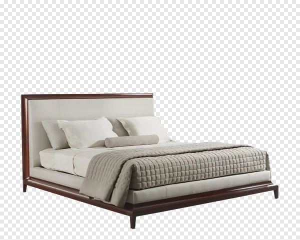 Download this stunning high-resolution PNG image of an elegant bed with a beige upholstered headboard and rich mahogany frame. Perfect for interior design websites, brochures, catalogs, or any project needing a luxurious bedroom image. The crisp white background makes it easy to incorporate into your designs. Download now for free and elevate your projects!