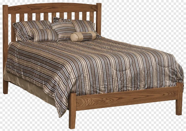 Enhance your designs with this high-resolution PNG image of a beautiful oak bed. Featuring a stylish, minimalist design and a rich brown finish, this image is perfect for interior design websites, furniture catalogs, or any project needing a high-quality bed image. Download now and elevate your visuals! The image showcases the bed with striped bedding in coordinating colors, offering a complete room setting for your project. Free for personal and commercial use.