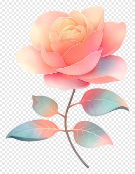 Discover this stunning free PNG of a dreamy pastel rose, featuring soft pink and peach petals that gracefully blend into delicate blue-green leaves. Its glossy, gradient design and subtle shimmer create a truly enchanting floral illustration. Perfect for adding a touch of elegance to invitations, scrapbooking, digital art, social media graphics, or any creative project. Download this beautiful transparent background rose for free and bring your designs to life with its ethereal charm!