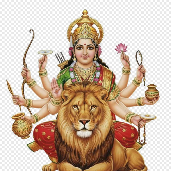 Download this stunning, high-quality free PNG of Durga Maa, the powerful Hindu goddess, majestically seated atop her lion mount. Adorned with a golden crown and traditional attire, she holds symbolic items like a bow, arrows, chakra, lotus, mirror, and kalash, with one hand in blessing. Perfect for Navratri, Durga Puja, spiritual projects, religious designs, educational content, or personal devotion. This transparent background image is ideal for seamless integration into any creative work. Get your free Maa Durga PNG now!