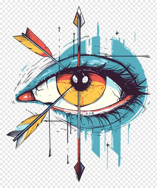 Download this captivating free PNG image featuring a dynamic abstract eye pierced by colorful arrows. Perfect for graphic designers, artists, or anyone seeking a bold and unique visual statement. This grunge-inspired art piece showcases a vibrant yellow and orange iris, sharp stylized lashes, and striking teal accents on a black background. Ideal for t-shirt designs, posters, social media, web graphics, or creative projects that demand attention. Get your high-quality, transparent eye and arrow graphic today and elevate your designs!